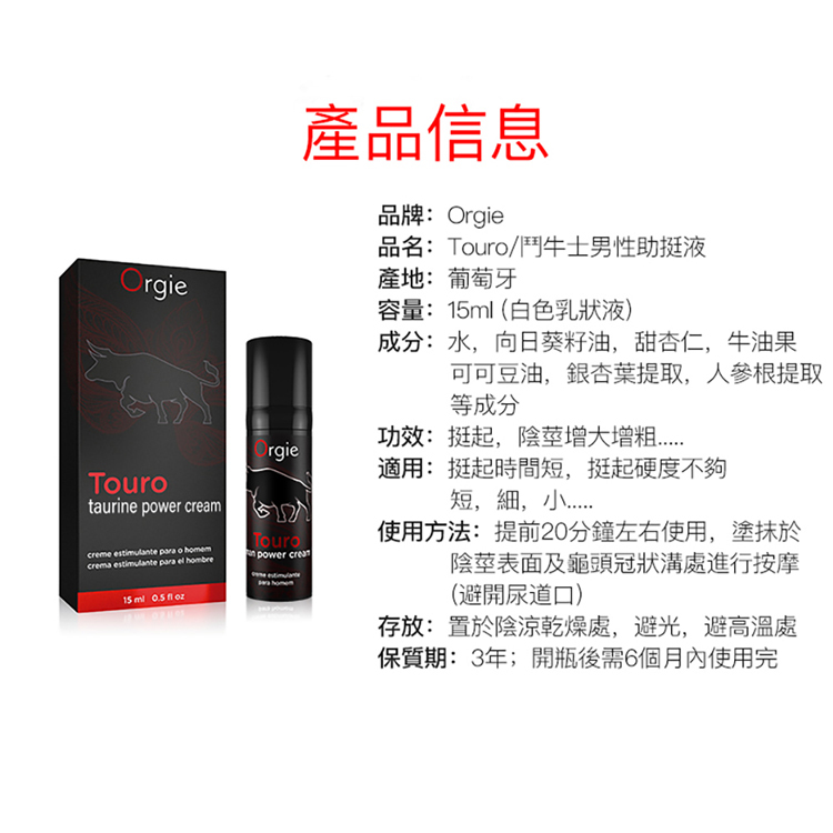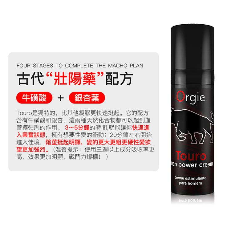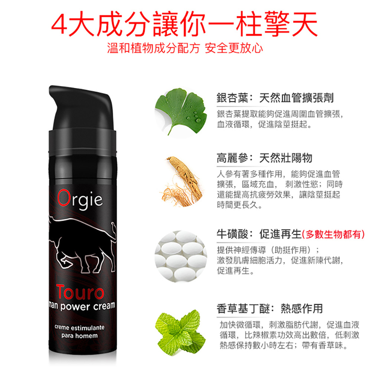 Touro 是一款增強勃起的乳霜,配方中含有牛磺酸和銀杏,這兩種天然活性成分具有血管擴張作用。