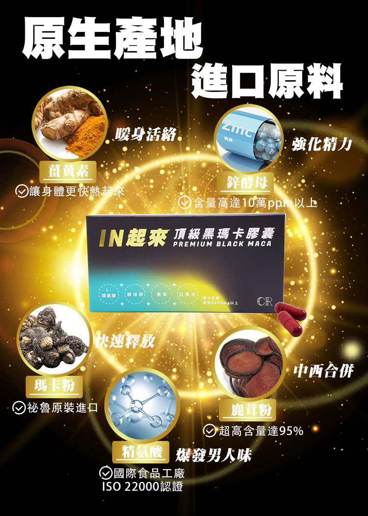 內容物成分:L-精華酸、瑪卡粉、微結晶狀-纖維素、鋅發酵母、生薑粉、硬脂酸、