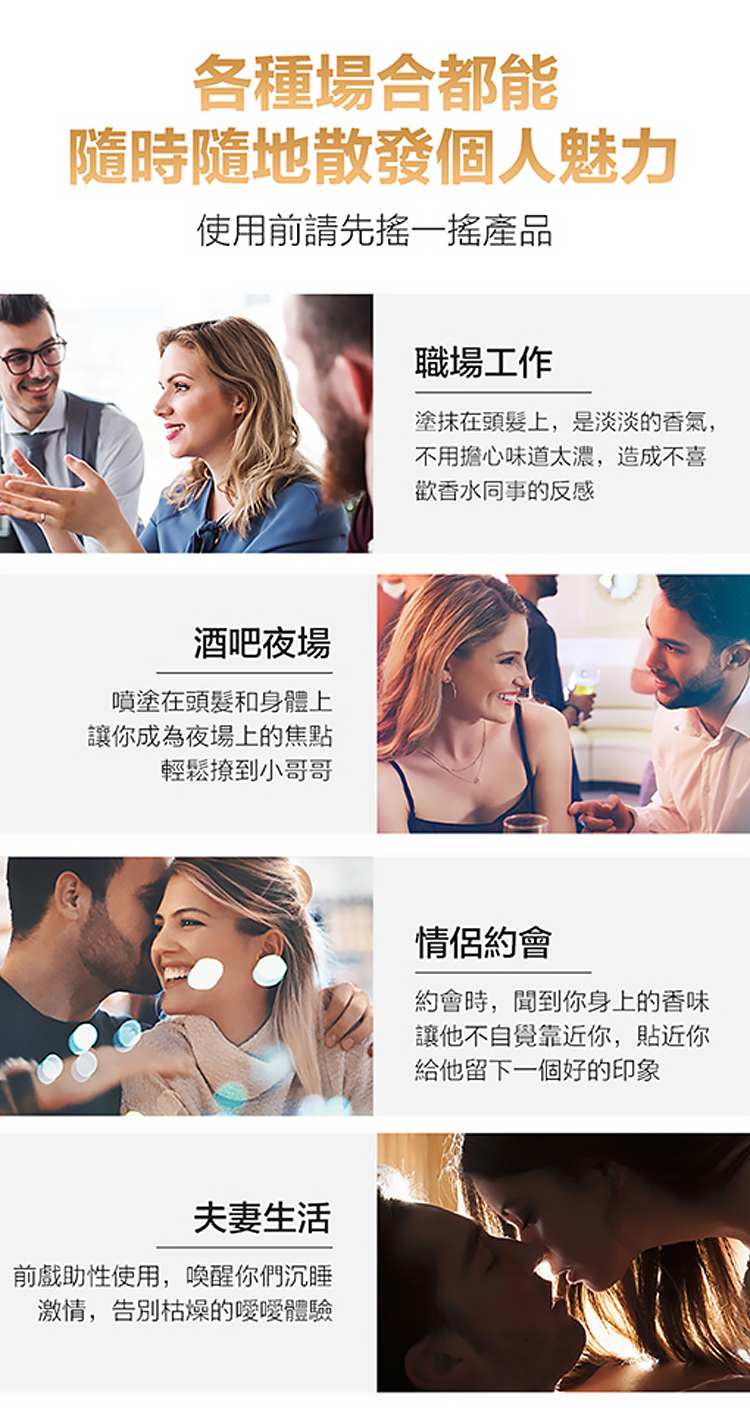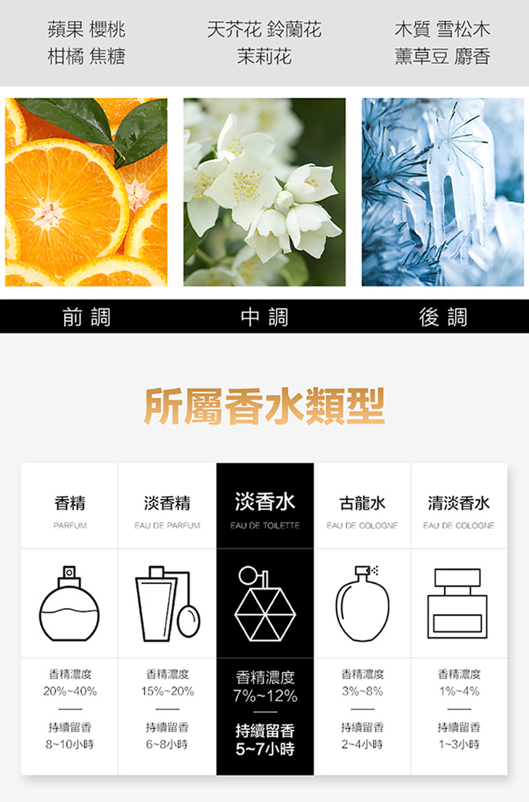 成份:水、香料、甘油、角豆提取物、茉莉花提取物、煙酰胺。