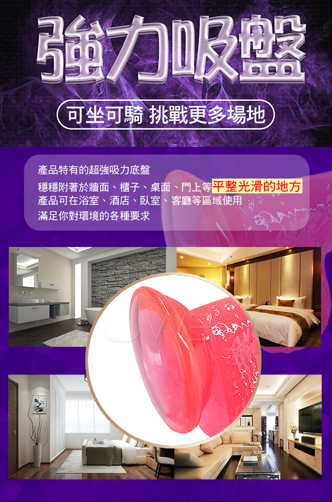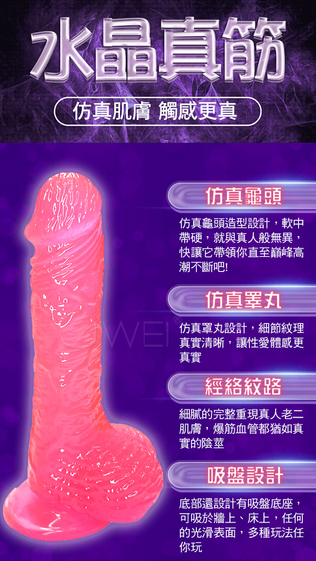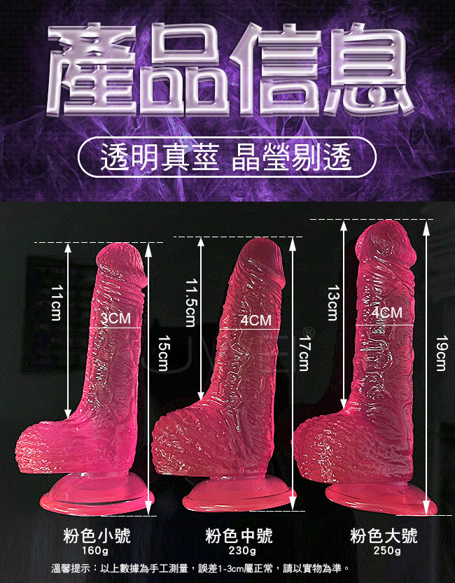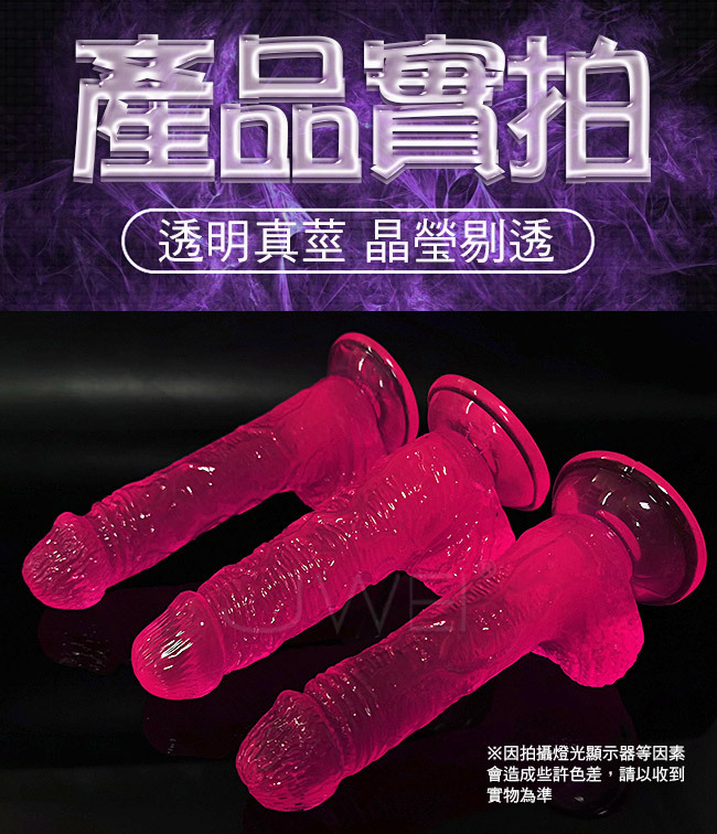 水晶真筋,仿真肌膚,觸感更真;晶瑩剔透,採用TPR材質 軟硬度適中;柔軟通透,柔軟有韌性 拿捏自如;凸起經絡,飽滿肉感 ,更真更刺激;不同的大小尺寸任君選擇,底部還設計有吸盤底座,可吸於牆上、桌上,任何的光滑表面;多種玩法任你玩,讓你性愛過程更有樂趣喔~