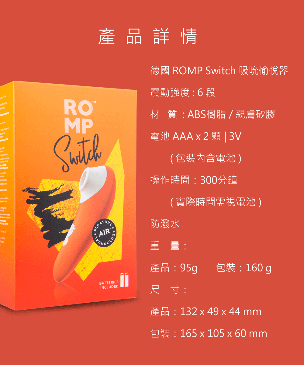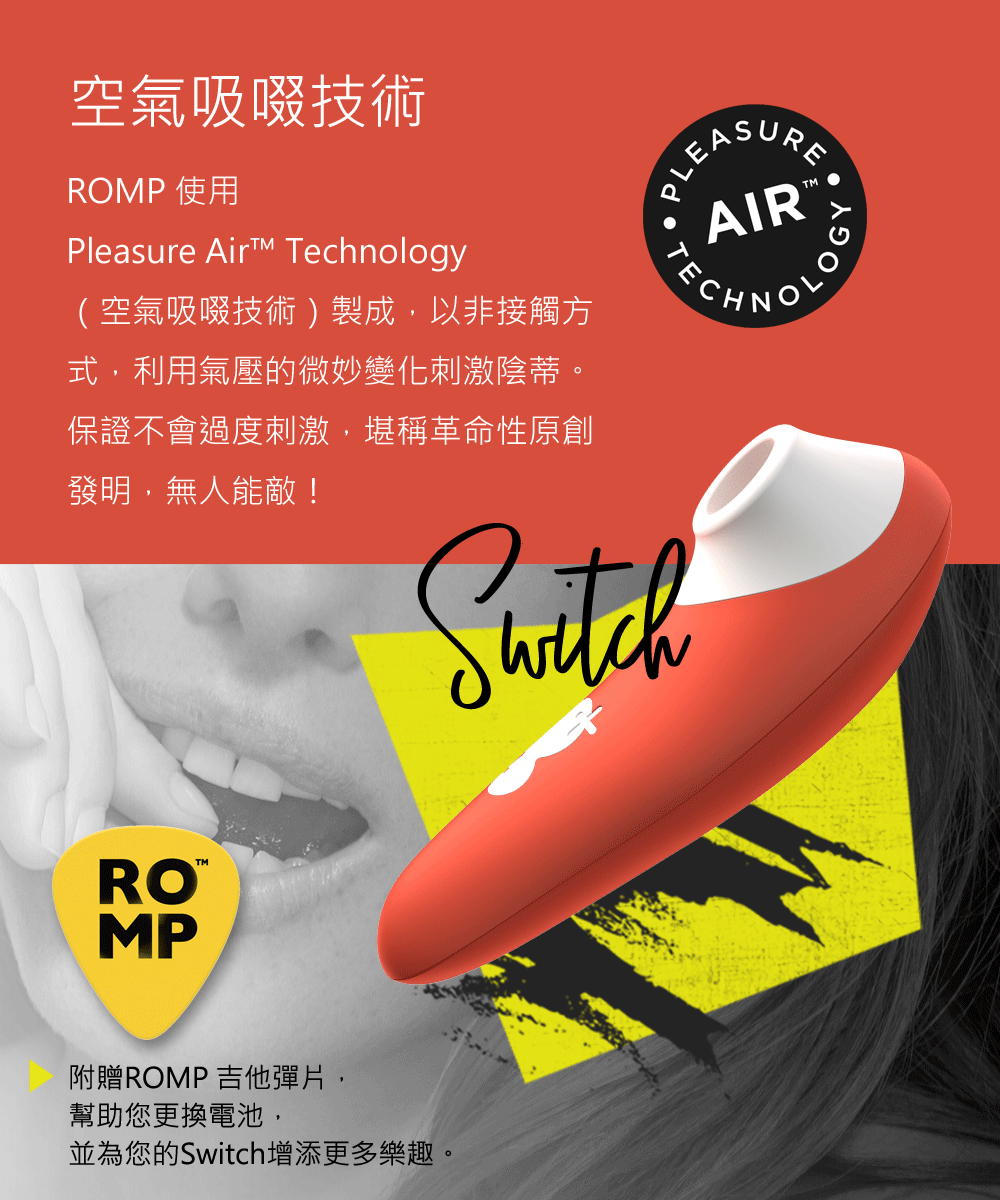 Switch 採用Pleasure Air™ Technology (空氣吸啜技術 ),以非接觸方式,利用氣壓的微妙變化刺激陰蒂。保證不會過度刺激,堪稱革命性原創發明,無人能敵!2顆電池強震300分鐘!