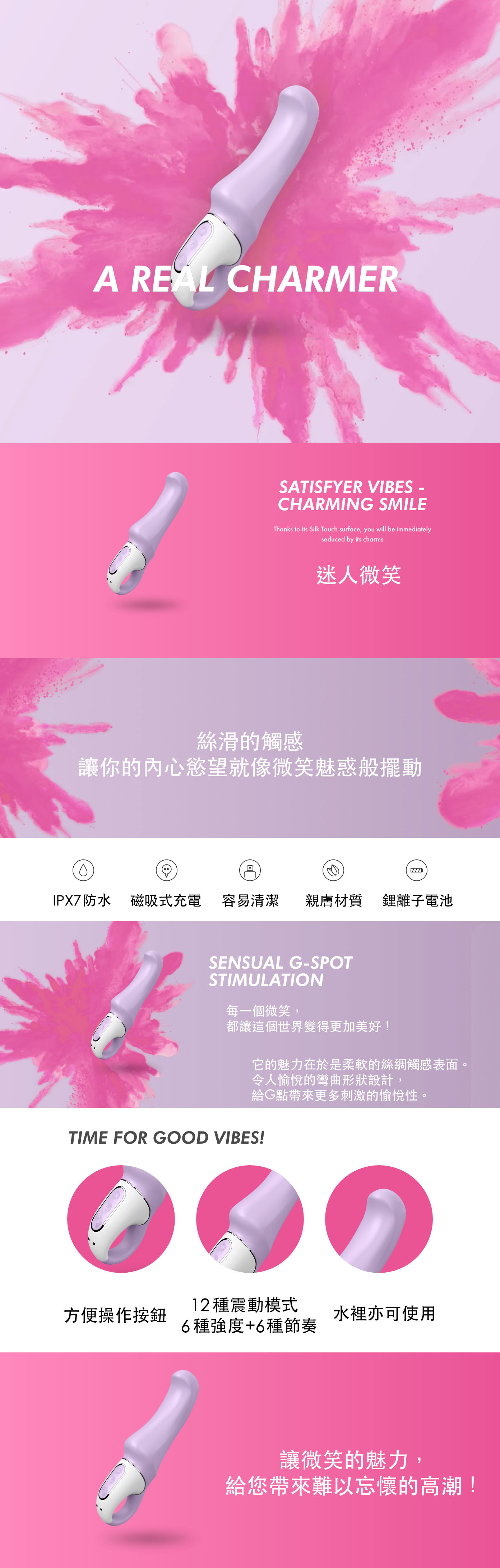 迷人的薰衣草紫,彎曲頂端 G 點刺激震動,完美人體工學曲線,更易探索女性神秘情慾。 使用親膚矽膠材質,表面光滑極具彈性,提供最有力和最深層的震動刺激,實用手柄能確保牢牢握住按摩棒,也適合全身敏感部位使用。 超強震動平均分布於機身,讓你由上至下,由內至外都能感受到強烈的快感! 其 IPX7 等級專業防水技術,讓你可以無拘無束地與 Charming Smile 一起於水中嬉戲,盡享感官刺激。 多功能用途,亦可以一般震動紓壓按摩使用。
