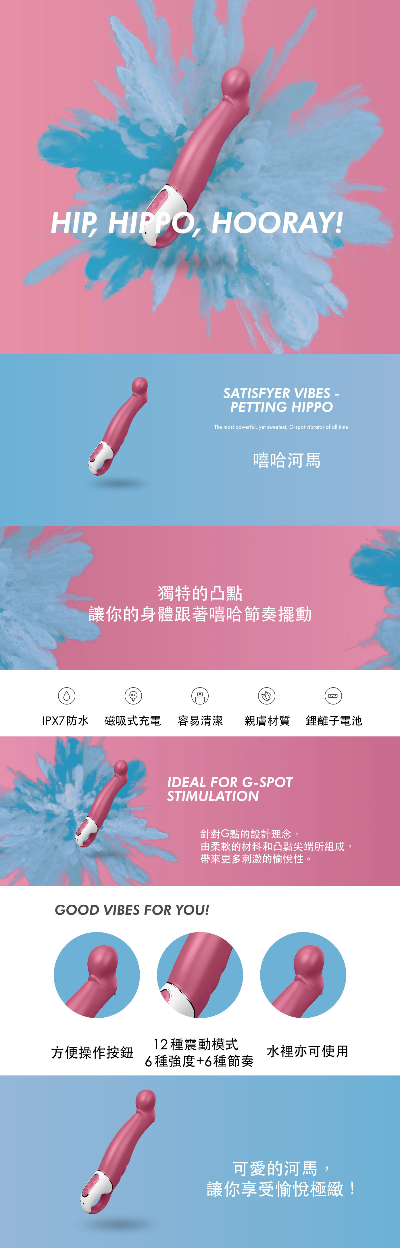 德國Satisfyer Petting Hippo 按摩棒,針對G點設計,前端前端圓潤彎曲如河馬造型,更加能刺激G點。包覆Q彈柔軟的親膚矽膠,機身紋路設計、滑順觸感,帶來強烈刺激愉悅。實用手柄能確保牢牢握住按摩棒,也適合全身敏感部位使用。超強震動平均分布於機身,讓你由上至下感受到強烈的快感!其 IPX7 等級專業防水技術,讓你可以無拘無束地與 Petting Hippo 一起於水中嬉戲,盡享感官刺激。多功能用途,亦可以一般震動紓壓按摩使用。