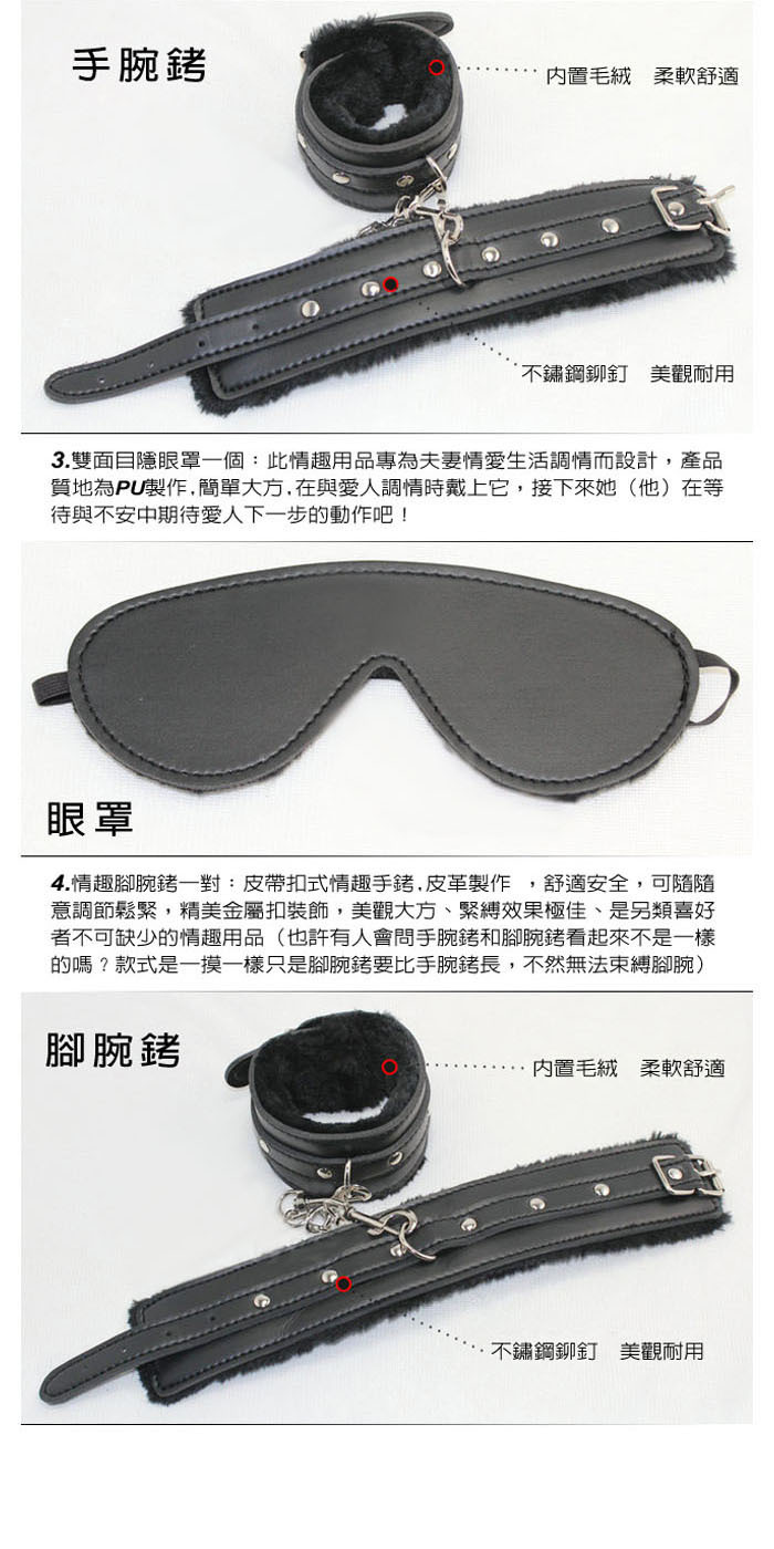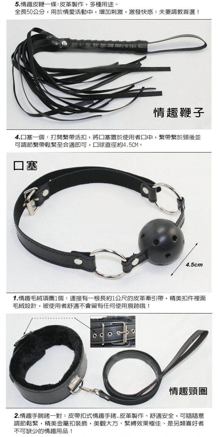 種類:SM皮革毛毛八件套(眼罩+鞭子+口塞+乳夾+手腕銬+腳腕銬+頸圈(含牽引繩)+挑逗棒)