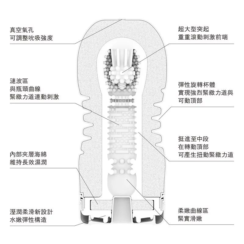 強力緊緻,自在刺激頂部!旋轉頂部,自由操控前端突起構造。曲線型新螺旋杯體,還能提供您連綿不斷的強烈緊緻刺激。