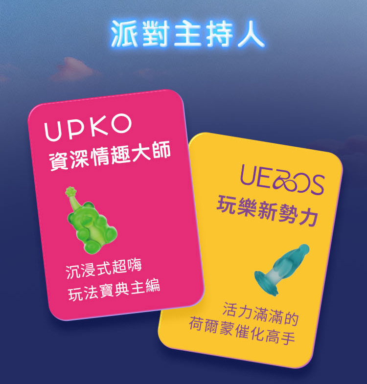 由 UPKO 資深情趣大師與 UEROS 玩樂新勢力聯手打造,首創沉浸式情趣玩具互動遊戲禮盒,用一場派對,喚醒久違的心跳與悸動。