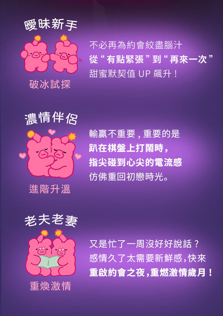 無論是曖昧新手、甜蜜伴侶,還是老夫老妻,都能在笑鬧與互動中拉近距離,讓默契升溫、激情回歸,把每一次約會都變成期待已久的派對時刻。