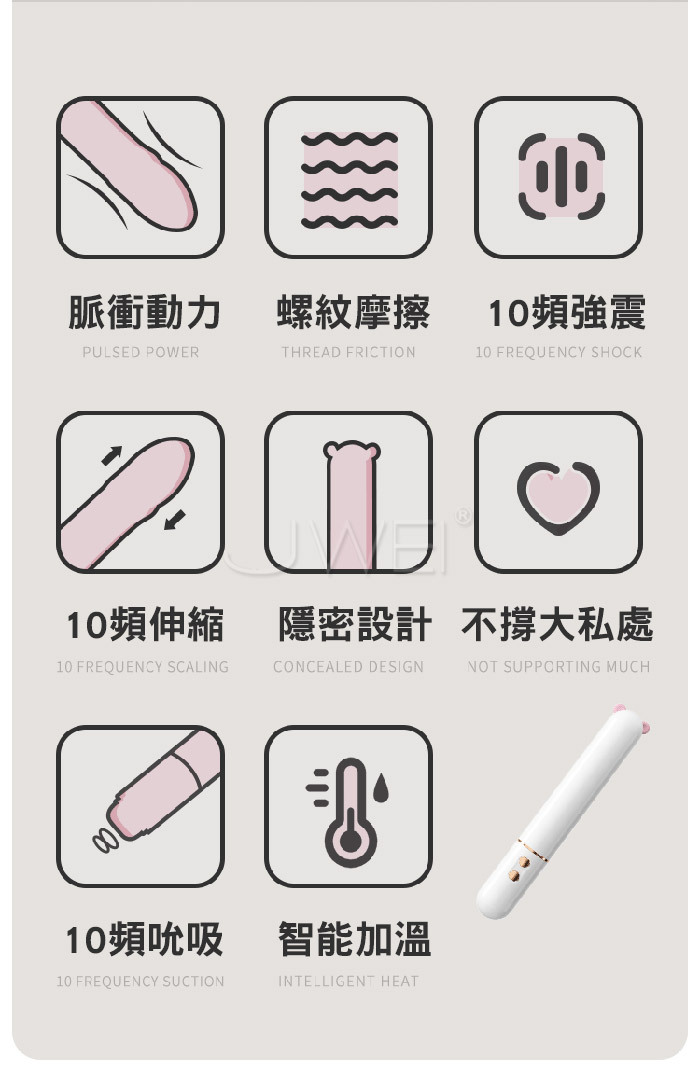 10頻伸縮:具備10種不同頻率的伸縮模式,模擬真實的推進感,提供更真實的體驗。
