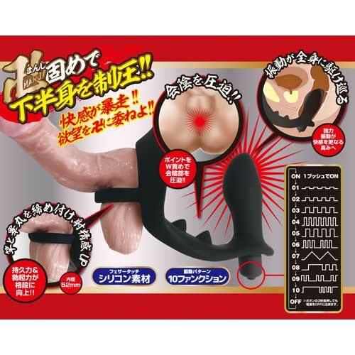 リング部分が竿と睾丸を締め付け、射精感UP!2か所の突起が会陰を、スティックローター内臓のプラグが前立腺を総攻撃!