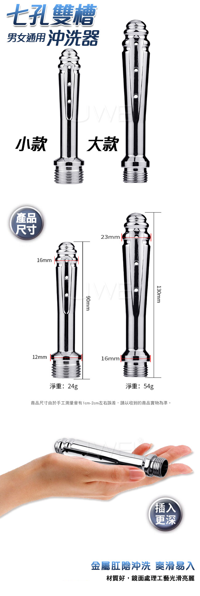 七孔雙槽男女通用沖洗器,金屬肛陰沖洗,爽滑易入,可伸入體內清洗,連接家用淋 浴軟管即可使用,安裝方便!人體工學流線型設計舒適握把,時尚外觀,防潮防鏽歷久 如新~單手即可操做旋轉把手上開關調節可自由掌握水流強弱,擁有七孔設計噴頭, 一體成型,讓水流分散更柔和避免肌膚受到刺激~
